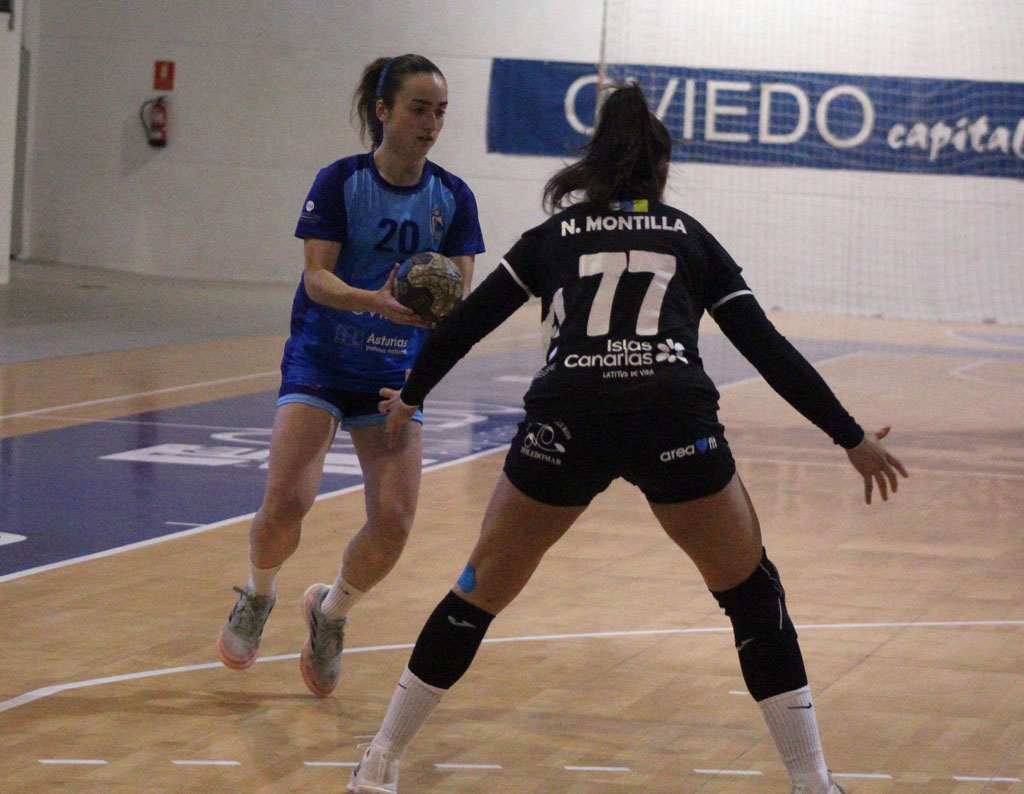 Comenzaron muy bien el partido las azules, que encontraban las grietas en la defensa canaria y tomaban tres goles de renta (5-2) tras apenas siete minutos de juego, obligando al entrenador del CICAR Lanzarote Ciudad de Arrecife a pedir tiempo muerto. Las carbayonas alcanzaban una máxima ventaja de cuatro goles (7-3) pero poco a poco las canarias, con una gran calidad individual, fueron apretando el marcador hasta llegar a disponer de dos balones para establecer el empate enfilando ya el final de la primera parte. Las ovetenses resistieron y llegaron al descanso por delante en el electrónico, aunque por la mínima (15-14).