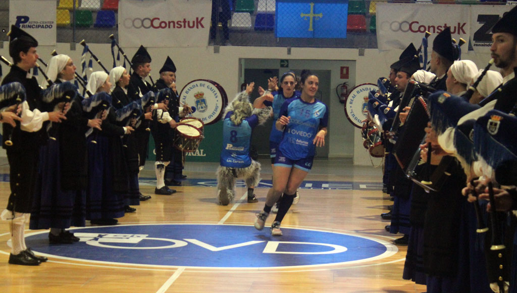 Los prolegómenos del encuentro estuvieron cargados de emoción, con la Real Banda de Gaitas Ciudad de Oviedo haciendo pasillo a las azules como flamantes campeonas de División de Honor Oro e interpretando el “Asturias, patria querida” justo antes de que los árbitros diesen el pitido inicial. Y el partido no pudo empezar mejor para el conjunto ovetense, que en apenas cuatro minutos y medio firmaba un parcial 4-0 de salida que obligaba al entrenador del Uneatlántico Pereda a pedir tiempo muerto, que no variaría la dinámica del choque porque tras nueve minutos de juego el técnico visitante agotaba su segundo tiempo muerto con siete goles ya de ventaja (8-1) para el cuadro carbayón. Fue camino del ecuador del primer período cuando las santanderinas fueron encontrándose y recortando distancias (10-5), manteniéndose la diferencia bastante estable hasta que se llegaba al descanso con 14-9 en el electrónico para las locales.